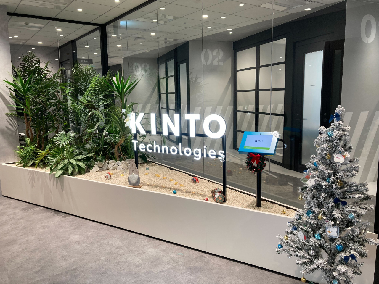 まずエントランスでお出迎えするのは、KINTO Technologiesのロゴ。 これ、ただの看板じゃありません。後ろの骨組みが黒にし、あえてロゴを「白」にして、しかも光らせてます。