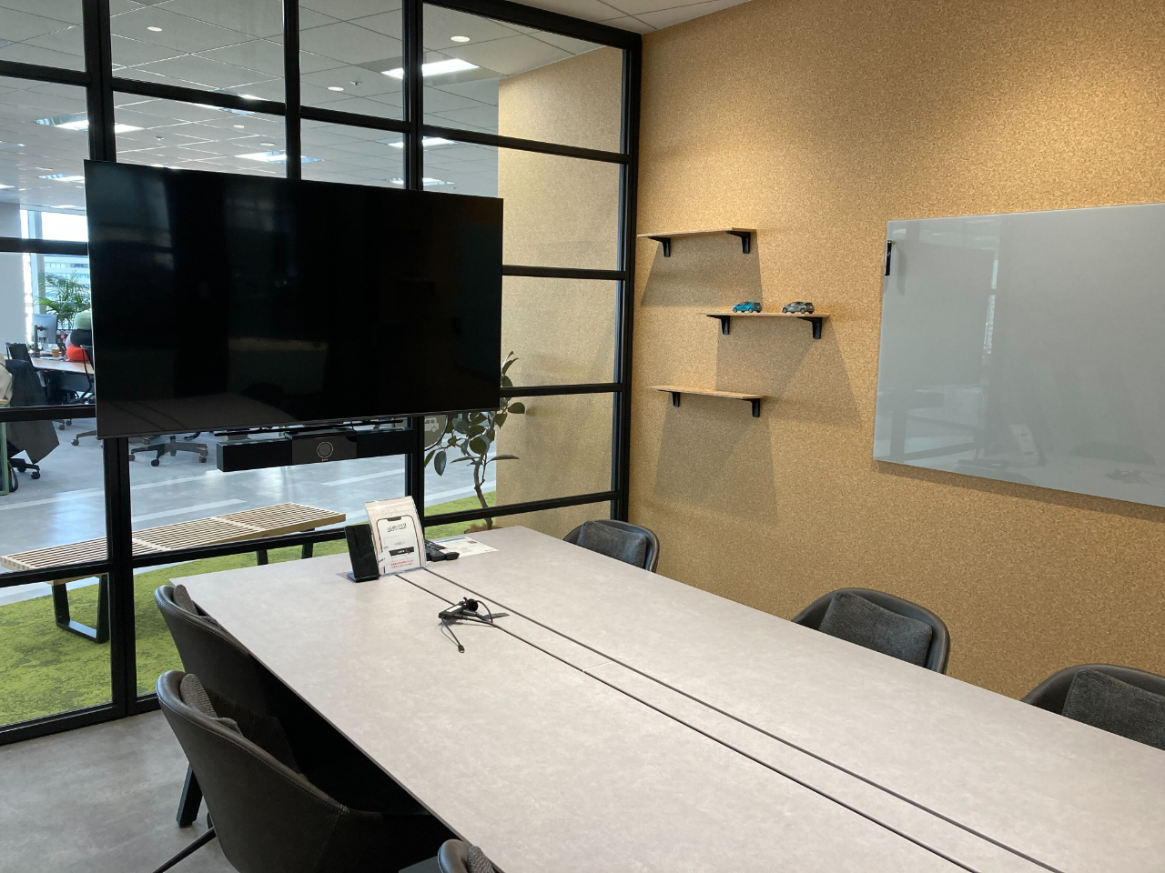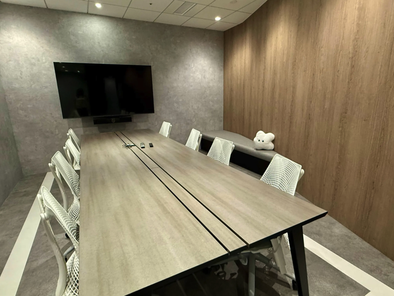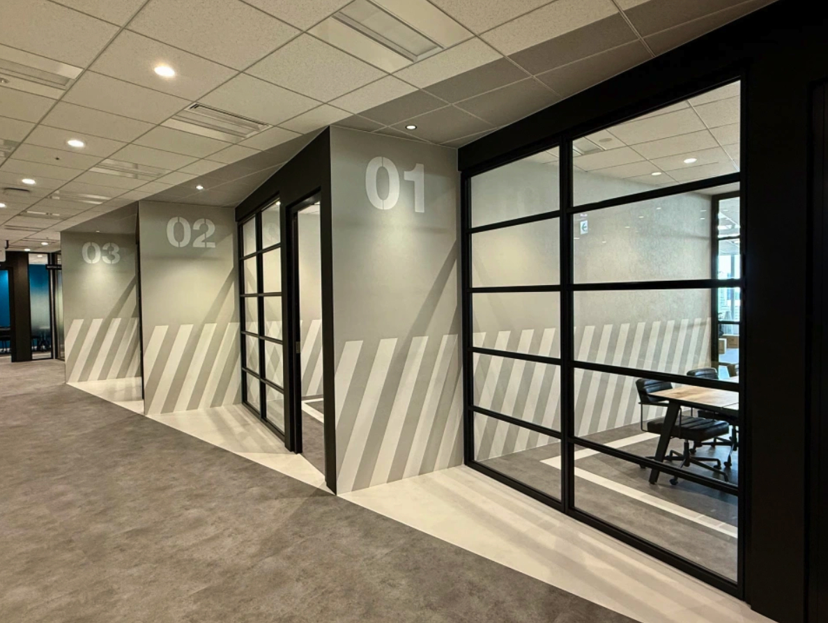 また核となる3つの会議室には天つりモニターにし、電動ブラインドを設置。