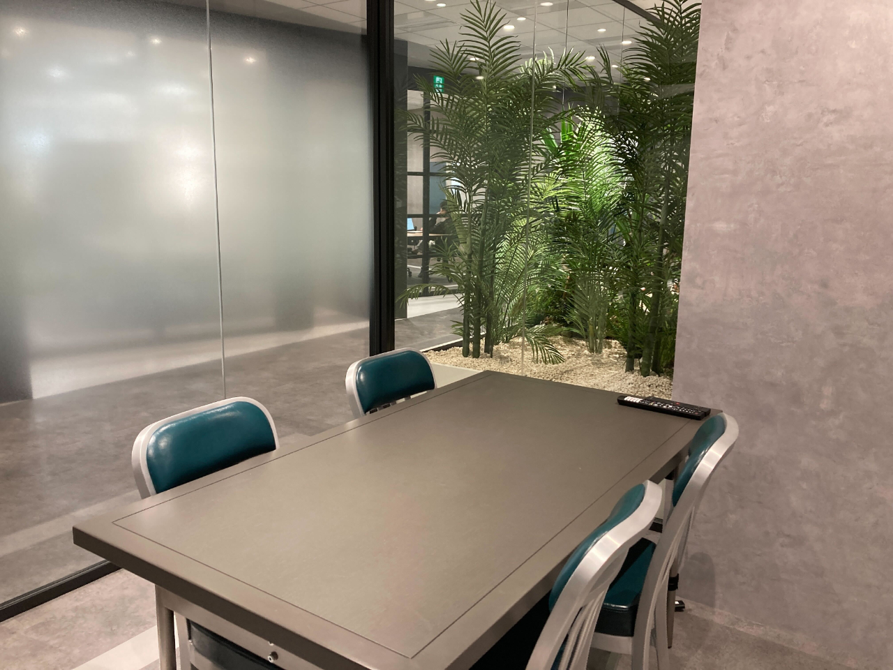 受付と反対側にある4人部屋。受付との一部をガラスにすることにより、ここでも緑が大活躍。癒してくれます。 小会議室の4人部屋。PIT Aと色違いの椅子を入れることで雰囲気がだいぶ変わりました。 机がビンテージ風でかっこいいんですが、真ん中から配線が出せないのが玉に瑕。でも、デザイナーさんの熱意に負けて入れました。