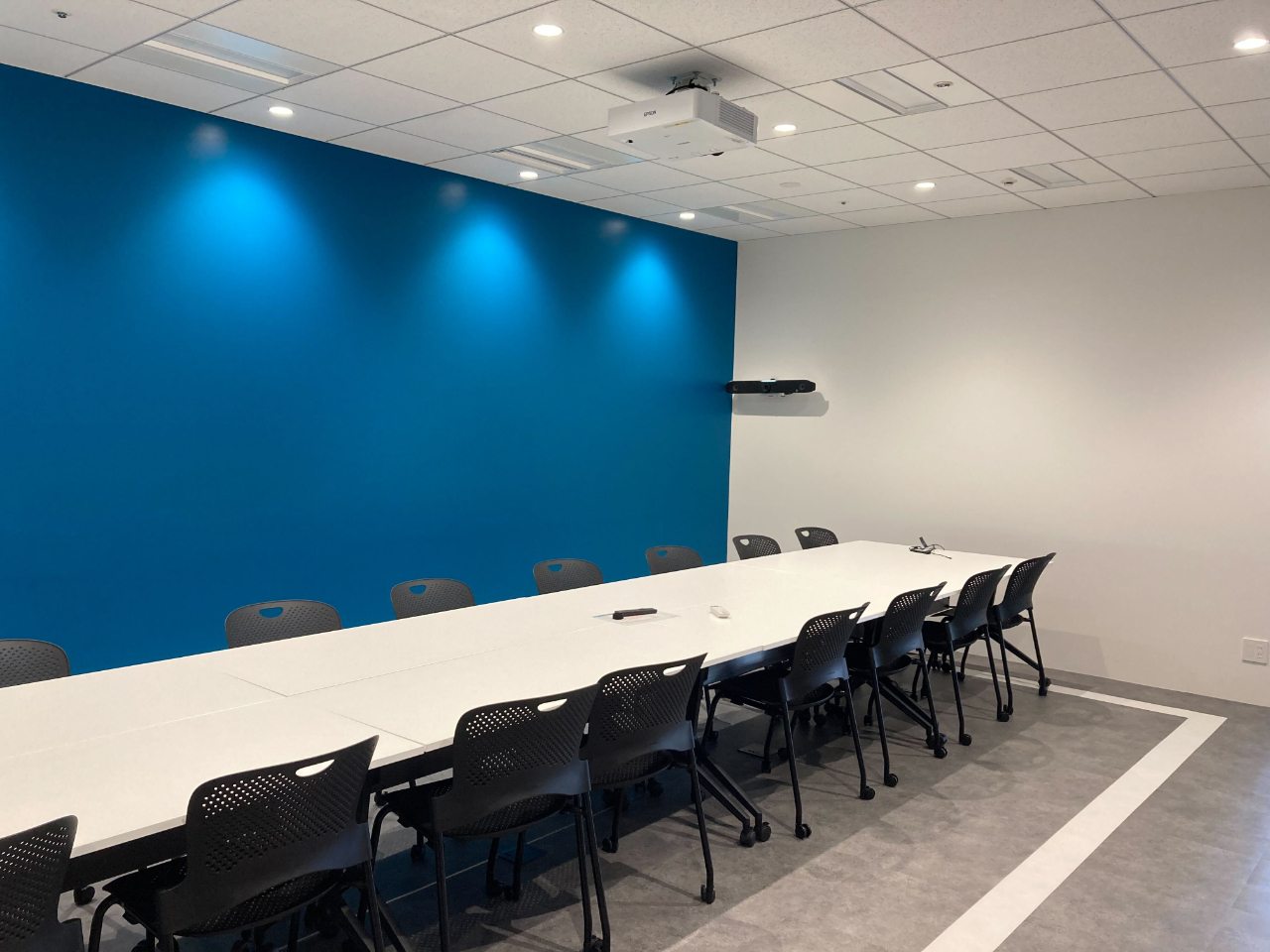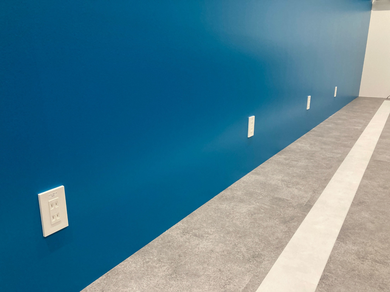ここはプロジェクター投影専用の壁紙を採用。スクリーンを下ろす手間がありません。机は可動式で、スクール形式にも対応。コンセントも爆量で用意してるので、勉強会もやり放題です。