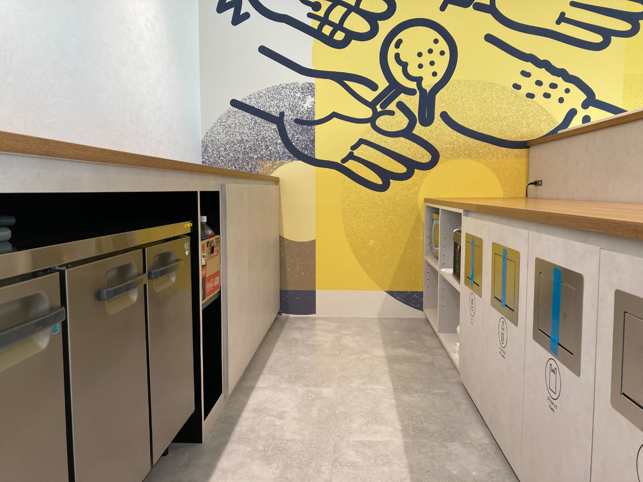 壁には大阪メンバーのクリエイティブによる巨大アートが! 「この指とまれ」をコンセプトに、大阪らしくたこ焼き、カニ、くいだおれ人形が描かれています。