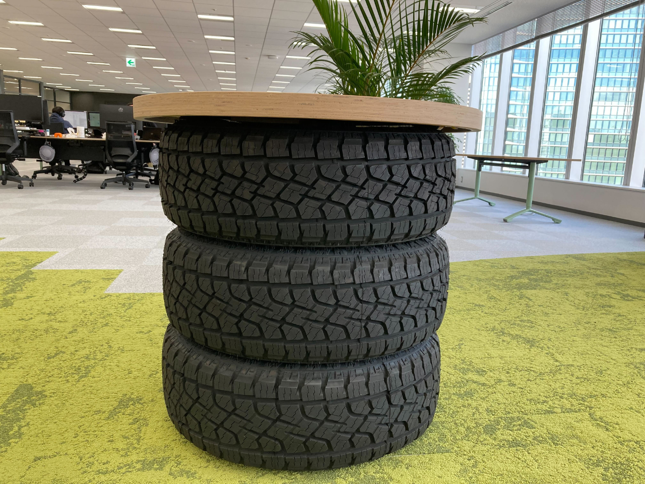 park部分には、なぜか巨大なタイヤが転がっています。 これ、中身が入った本物のSUVタイヤです。最初はノーマルタイヤだったんですが、「そんなんじゃダメだ!ゴツゴツしたやつがいい!」とわがままを言って変えてもらいました。