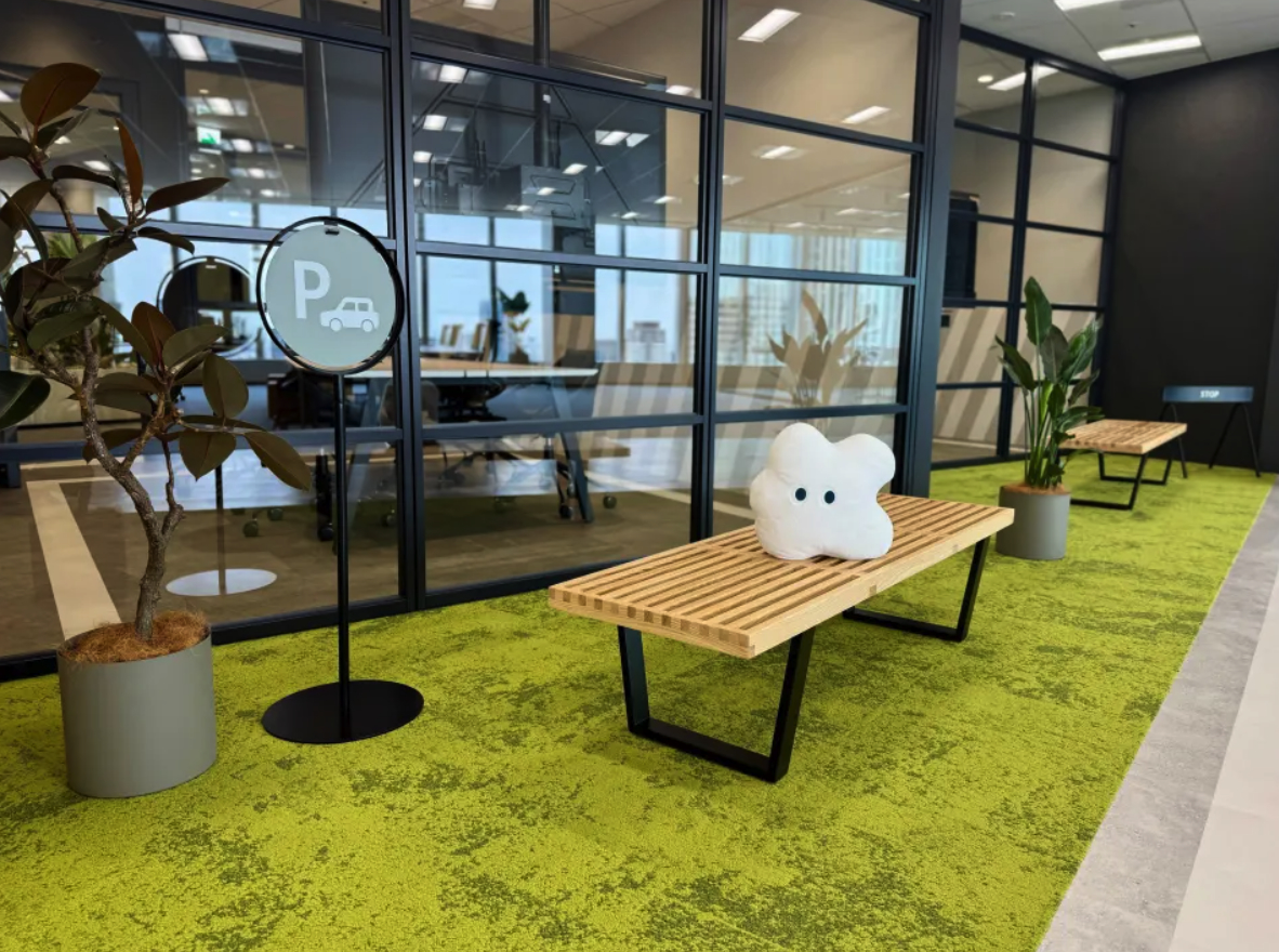 靴を脱いでくつろげるグリーンカーペットは、まるでオフィス内ピクニック場!