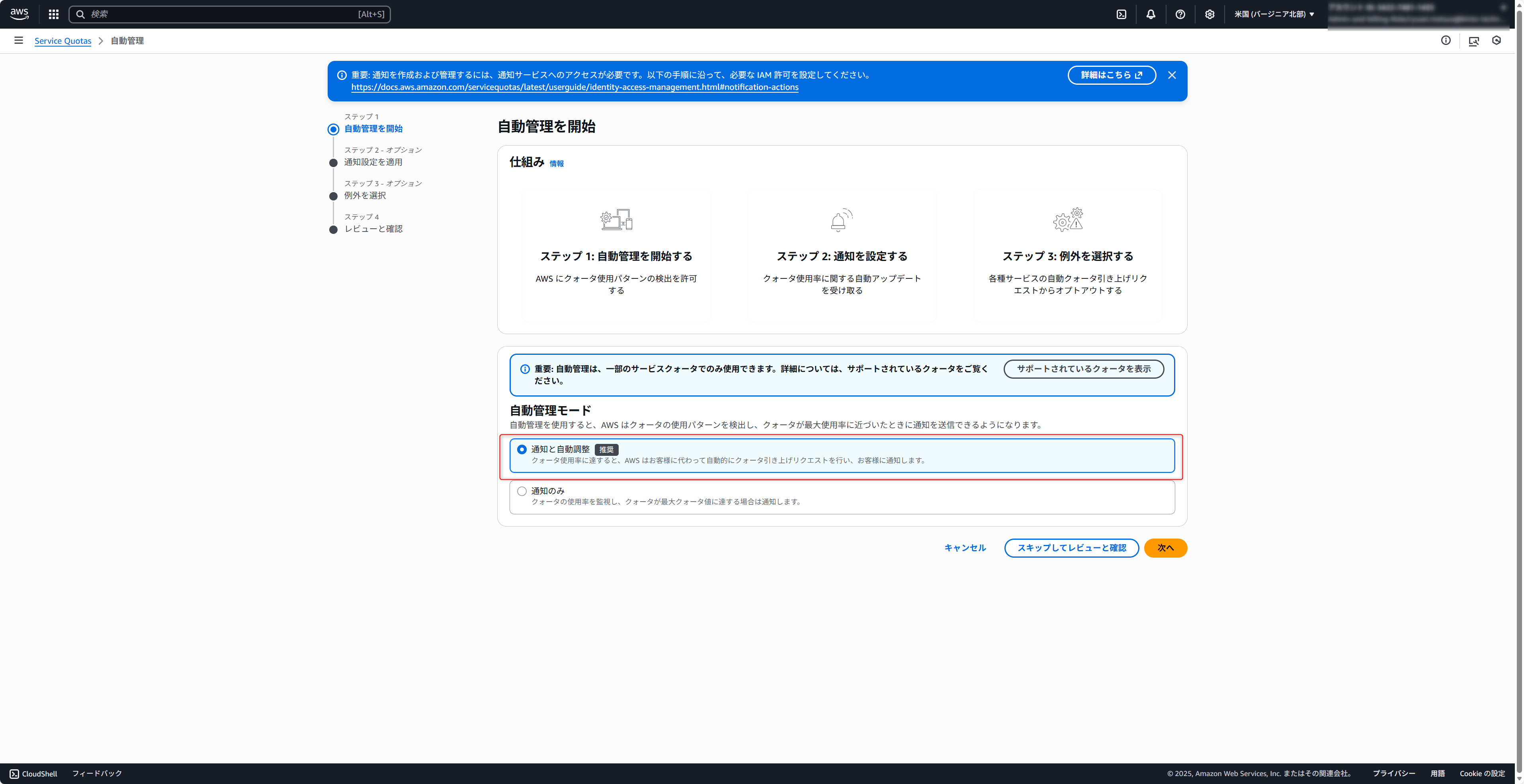 - Service Quotasの自動管理を「通知と自動調整」モードで有効化