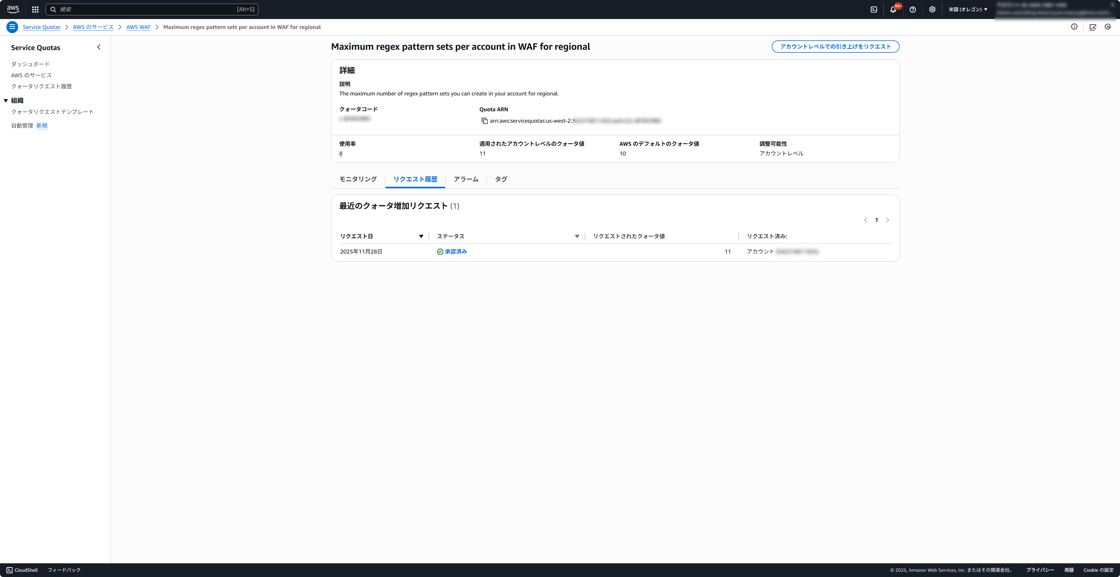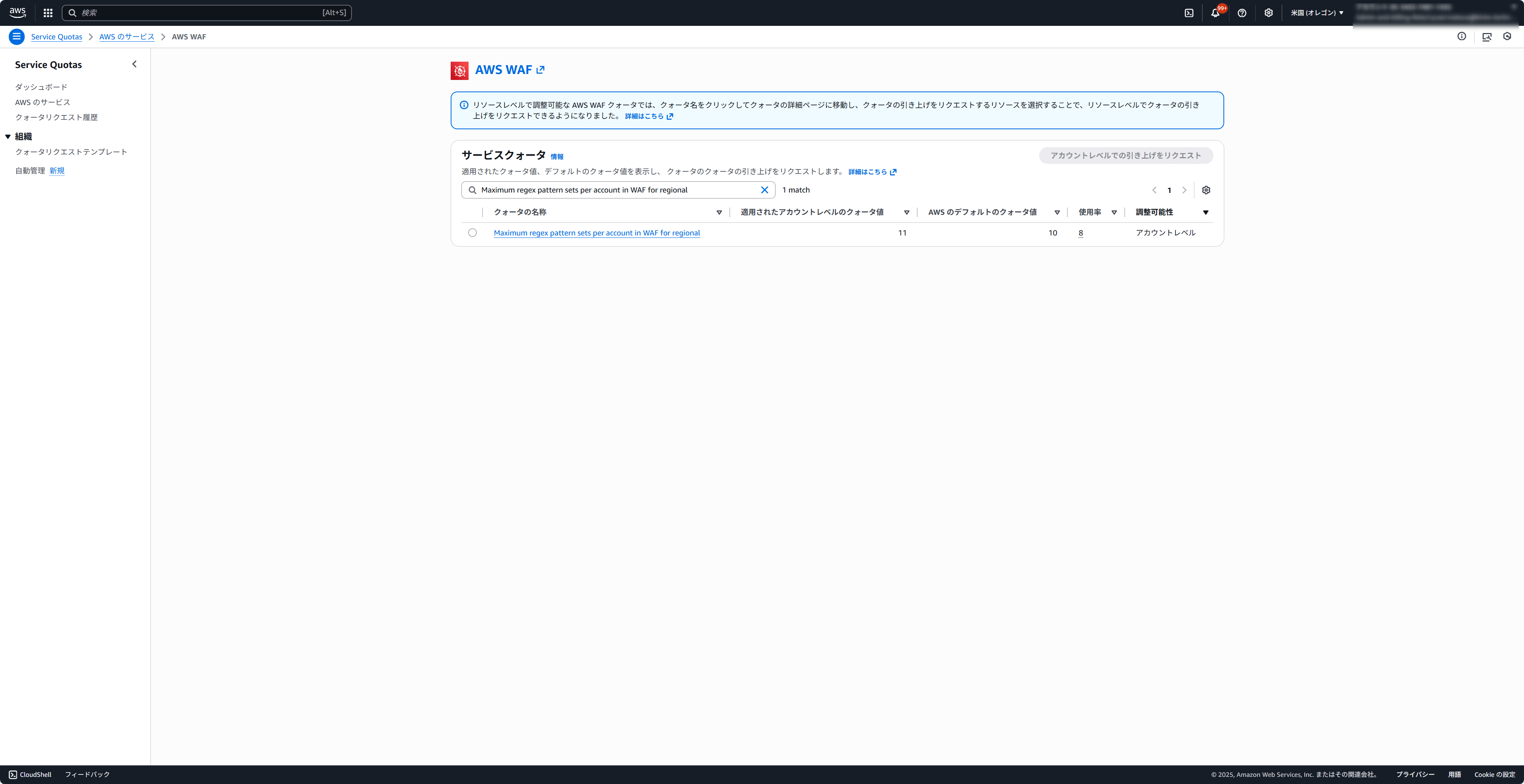 - Service Quotas → AWS WAF → 「Maximum regex pattern sets per account in WAF for regional」