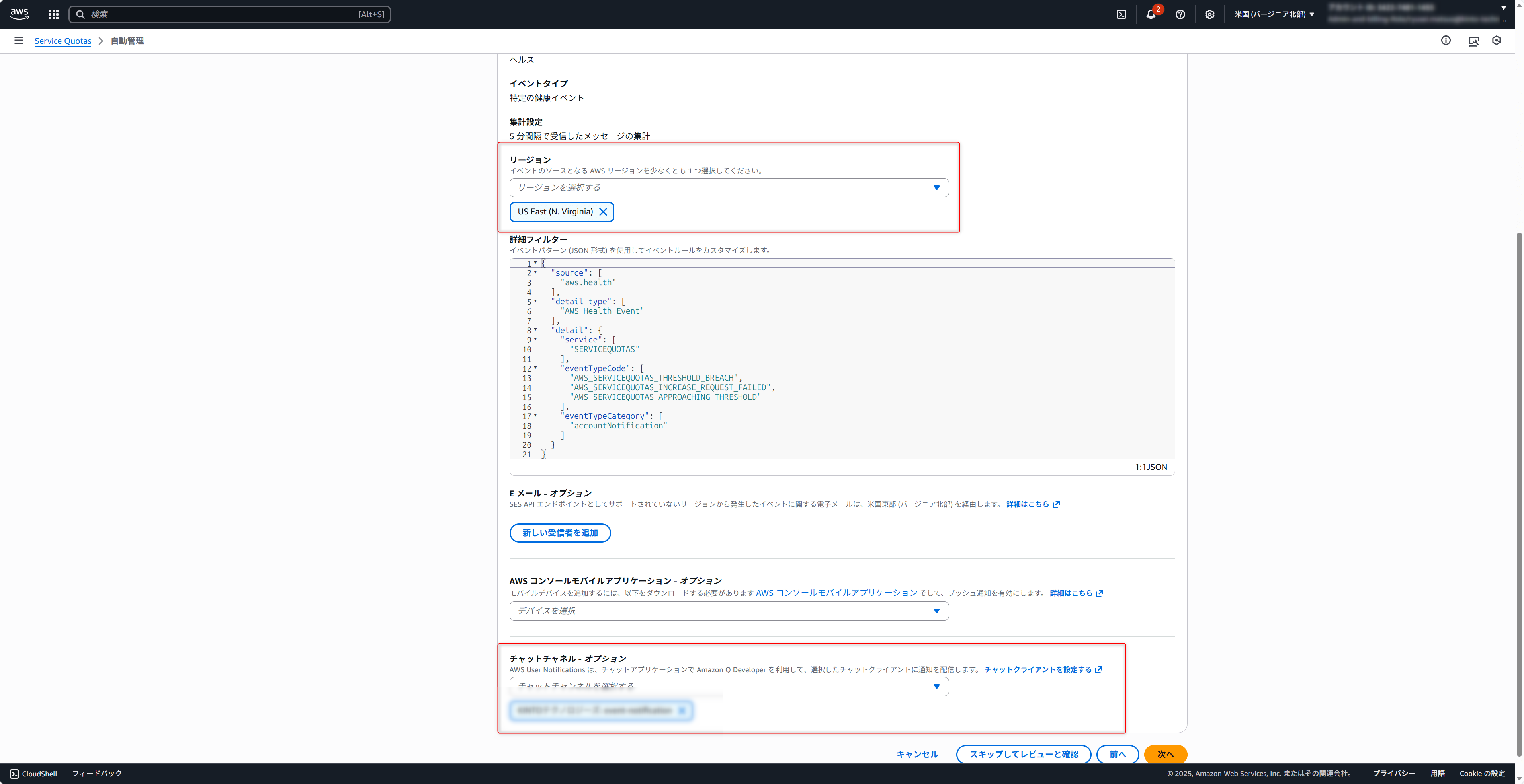 監視したいリージョンごとに自動管理の設定が必要です(自動管理とAWS User Notificationsは別設定だからちょっとややこしい)